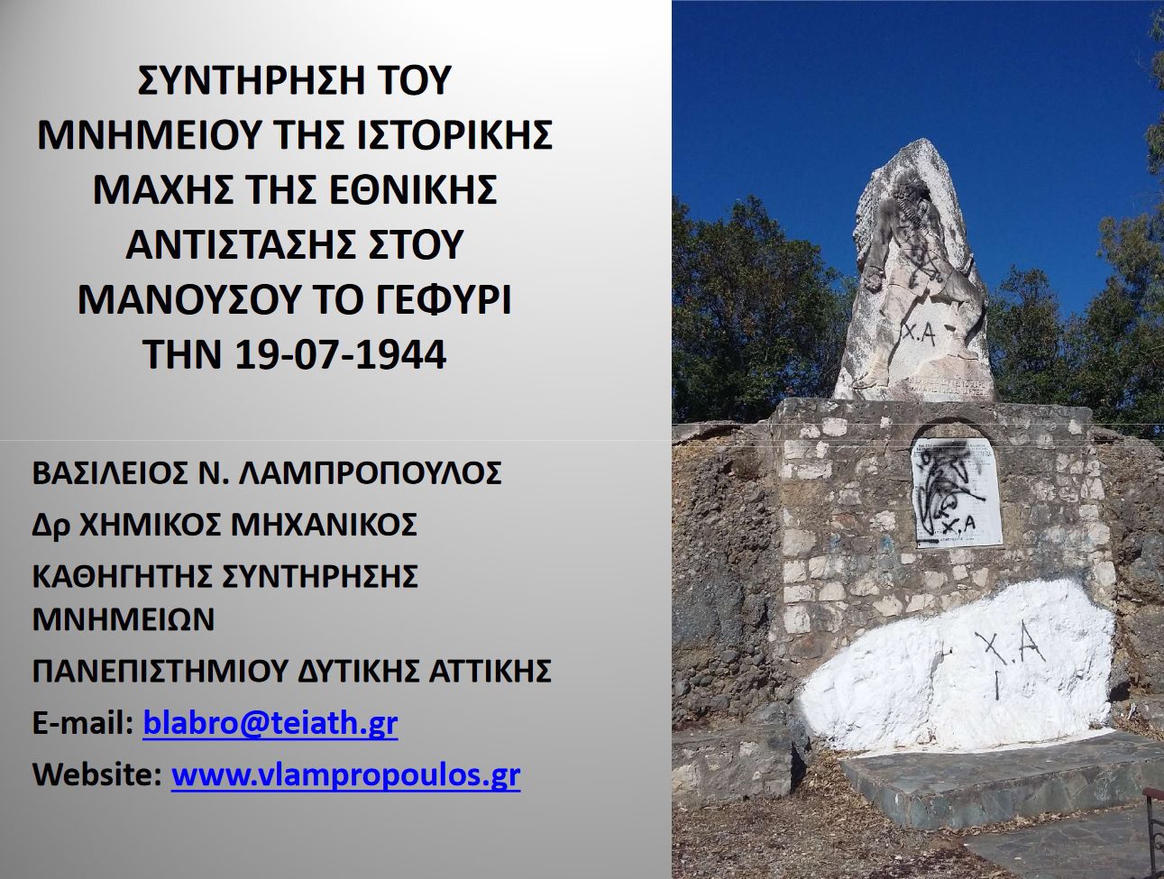 Η Συντήρηση του Μνημείου της Ιστορικής Μάχης στου Μανούσου το Γεφύρι την 19-07-1944, στη Χώρα Τριφυλίας Μπορείτε να κατεβάσετε το αρχείο από το παρακάτω link: https://www.dropbox.com/s/b65ypmbm1737bep/%CE%A3%CE%A5%CE%9D%CE%A4%CE%89%CE%A1%CE%97%CE%A3%CE%97%20%CE%93.%20%CE%9C%CE%91%CE%9D%CE%9F%CE%A5%CE%A3%CE%9F%CE%A5.pdf?dl=0